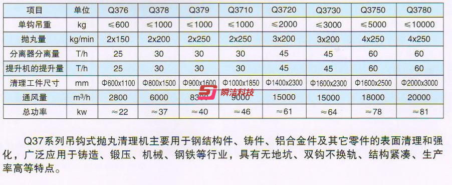 該系列型號拋丸機(jī)有Q374單吊鉤式拋丸機(jī)、Q376雙吊鉤式拋丸機(jī)、Q378雙吊鉤式拋丸機(jī)等。